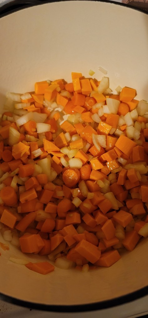 1. Chop onion, carrot, and sweet potato. Heat on in over medium for 3-5 minutes.